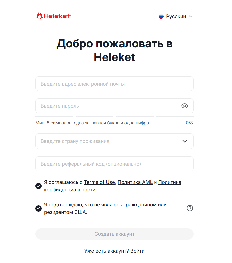- Соглашаемся с политикой конфиденциальности и AML, подтверждаем отсутствие статуса резидента США и жмем «Создать аккаунт».