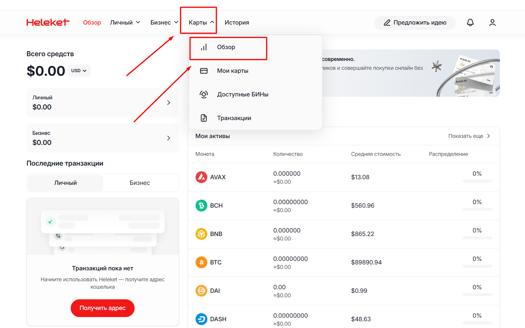 После подтверждения регистрации через письмо на электронную почту, вы автоматически попадете в личный кабинет сервиса Heleket. Так как нам нужны именно виртуальные карты — ищем соответствующий раздел в главном меню. Выбираем «Карты», затем «Меню» и попадаем в раздел с виртуальными картами.