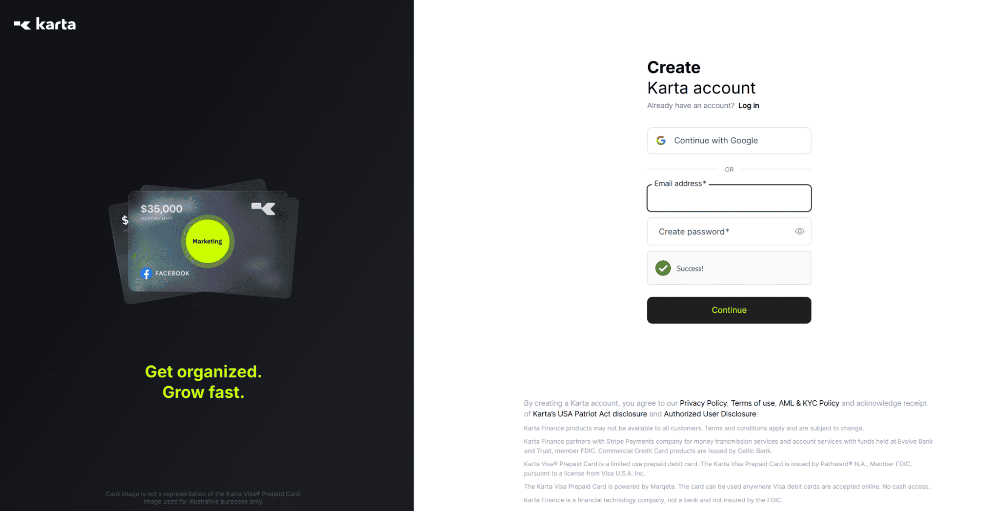 Теперь — Karta Business: переходим на страницу регистрации кликая на соответствующую кнопку на странице продукта, или напрямую — вот по этой ссылке.