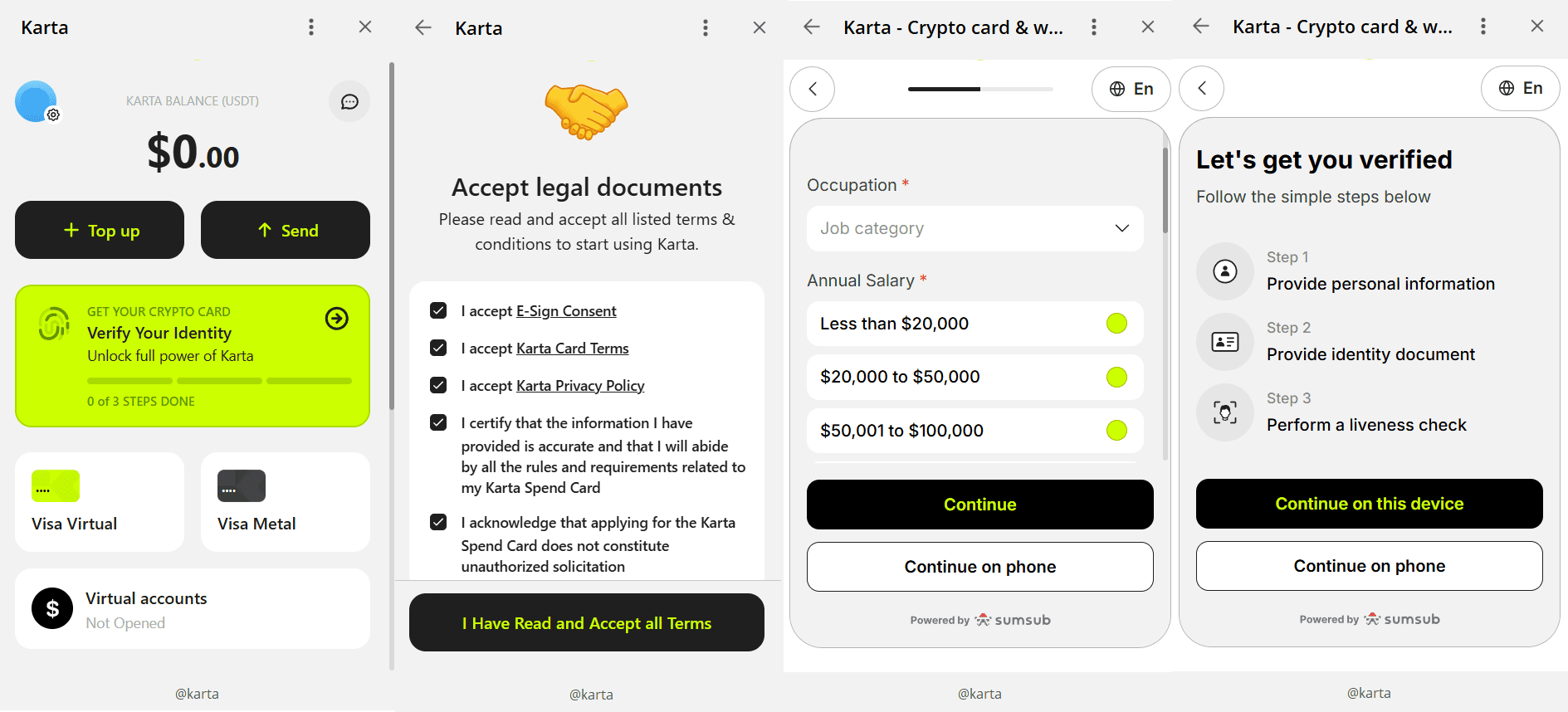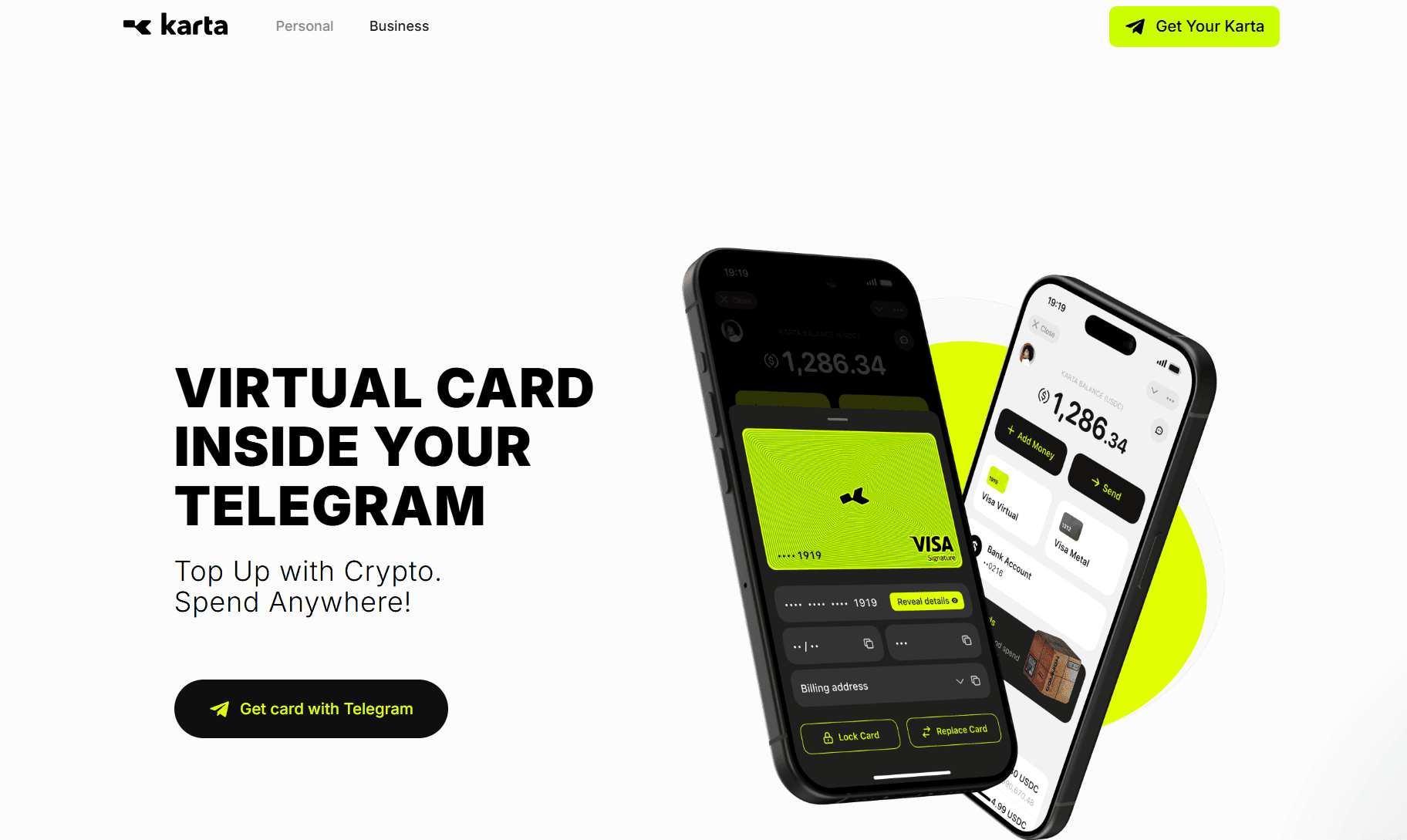 На первый взгляд Karta — это интересный сервис, который позволяет использовать виртуальные карты для повседневных расходов прямо в Telegram. С другой стороны — обязательные KYC (для Personal) и KYB (для Business), которые немного отпугивают среднестатистического пользователя — даже просто посмотреть функционал сервиса и пройтись по личному кабинету без верификации нельзя.