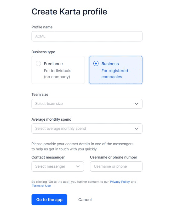 Теперь важный момент: Karta Business предлагает два варианта учетной записи: Business и Freelance. В первом случае некоторые финансовые условия будут выгоднее (например, выпуск карты стоит всего $0,5). Подробнее: