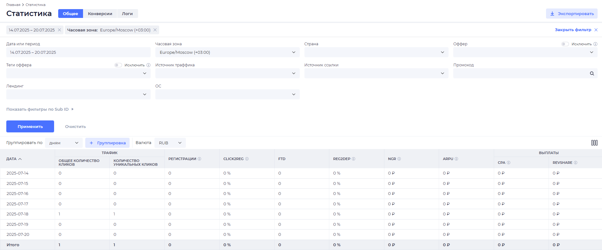 Не менее важный раздел для мониторинга активностей и анализа рекламных кампаний в целом — «Статистика». Помимо множества фильтров для максимально точной аналитики, здесь также доступна опция выгрузки отчетов в форматах XLSX и CSV.