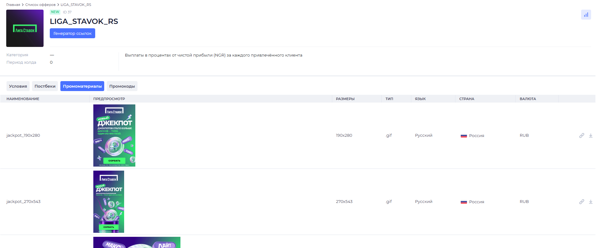 Ключевой раздел личного кабинета, с которого начинается работа — это «Офферы». Именно здесь вы можете выбрать модель оплаты, подключить партнерские ссылки, настроить промо и постбэки.