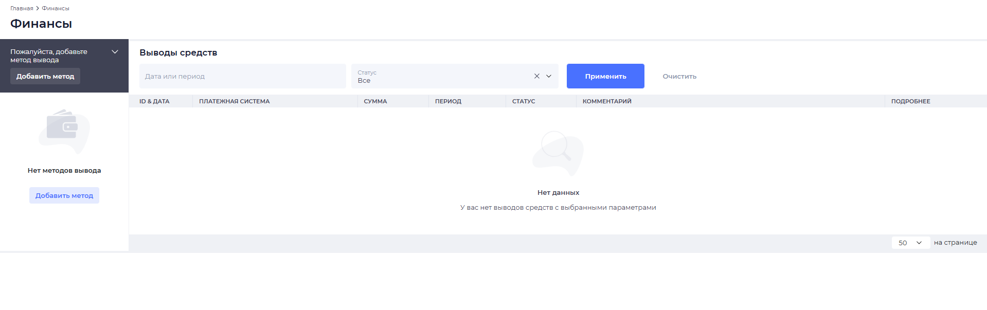 «Финансы» — раздел, в котором вы можете добавлять различные способы оплаты и отслеживать выплаты со стороны партнерки.