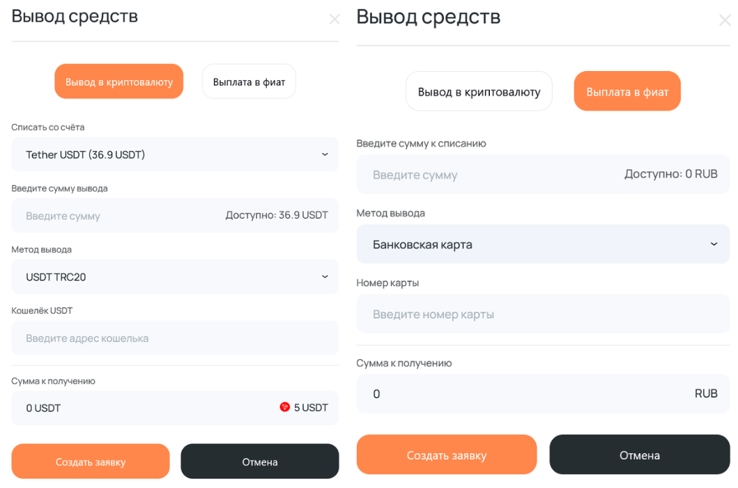 - Возможность хранения баланса как usdt, так и в фиате.
