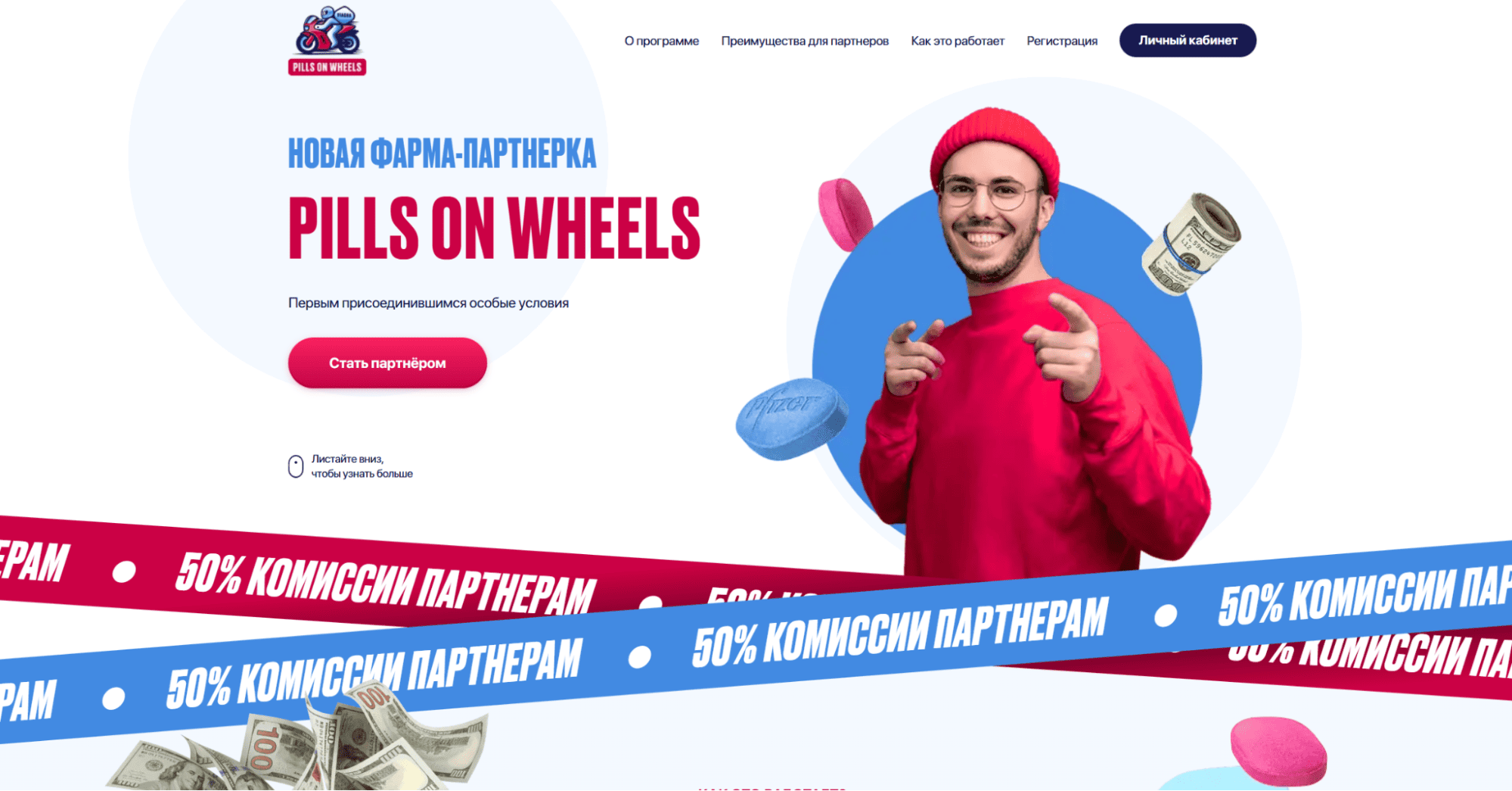 Сейчас мы поближе познакомимся с Pills on wheels, детально рассмотрим комиссии, офферы, зарегистрируем учетную запись, ознакомимся с личным кабинетом и его возможностями.