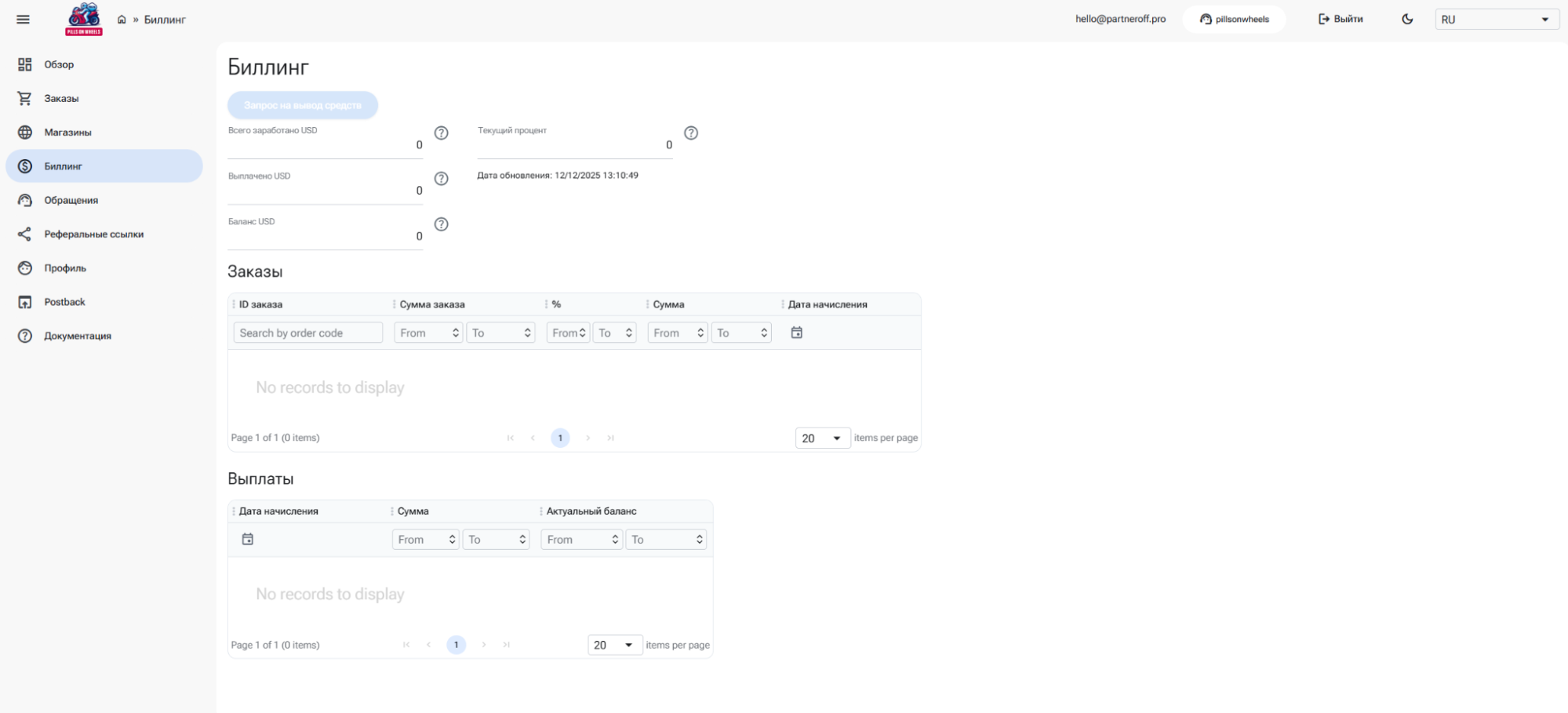 «Биллинг» — раздел с детальной информацией по балансам, выплатам и лидам.