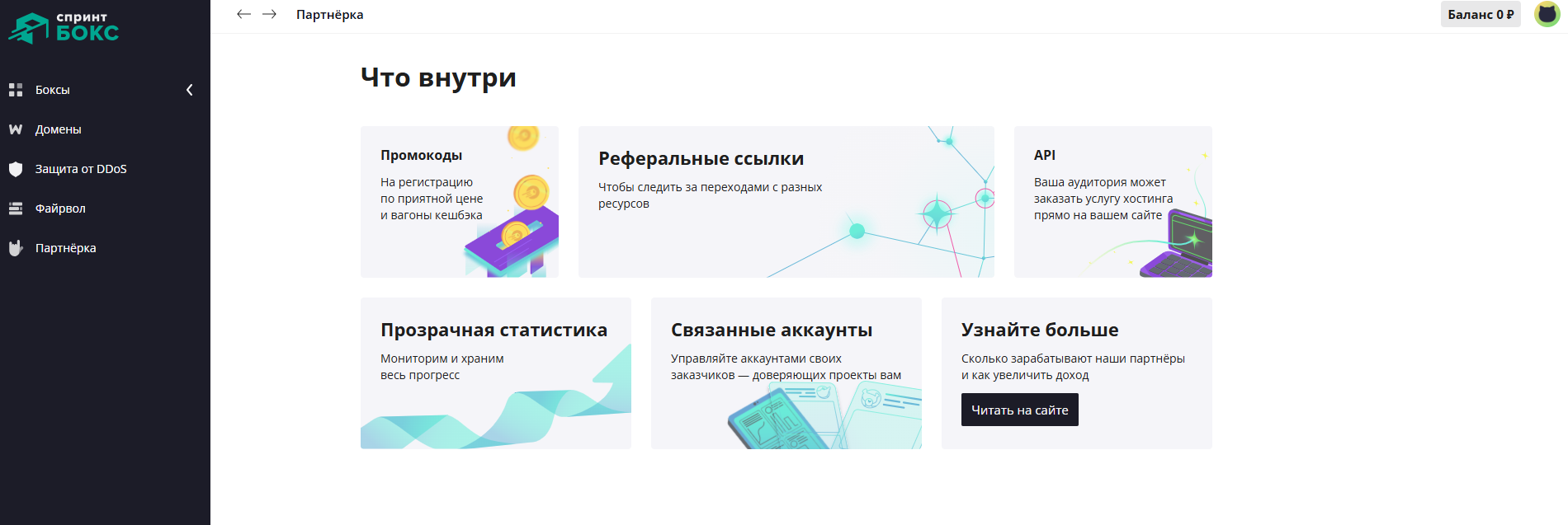 Sprintbox предлагает клиентам поучаствовать в партнерской программе, которая также работает и для «Спринтхост». По условиям вы можете зарабатывать до 40% от каждого пополнения привлеченных вами клиентов.