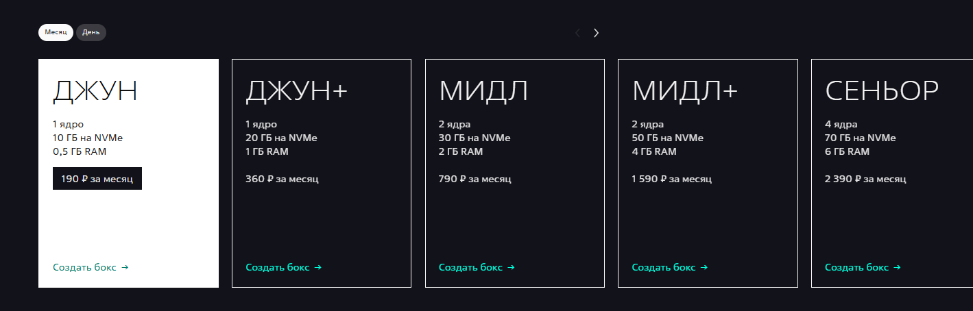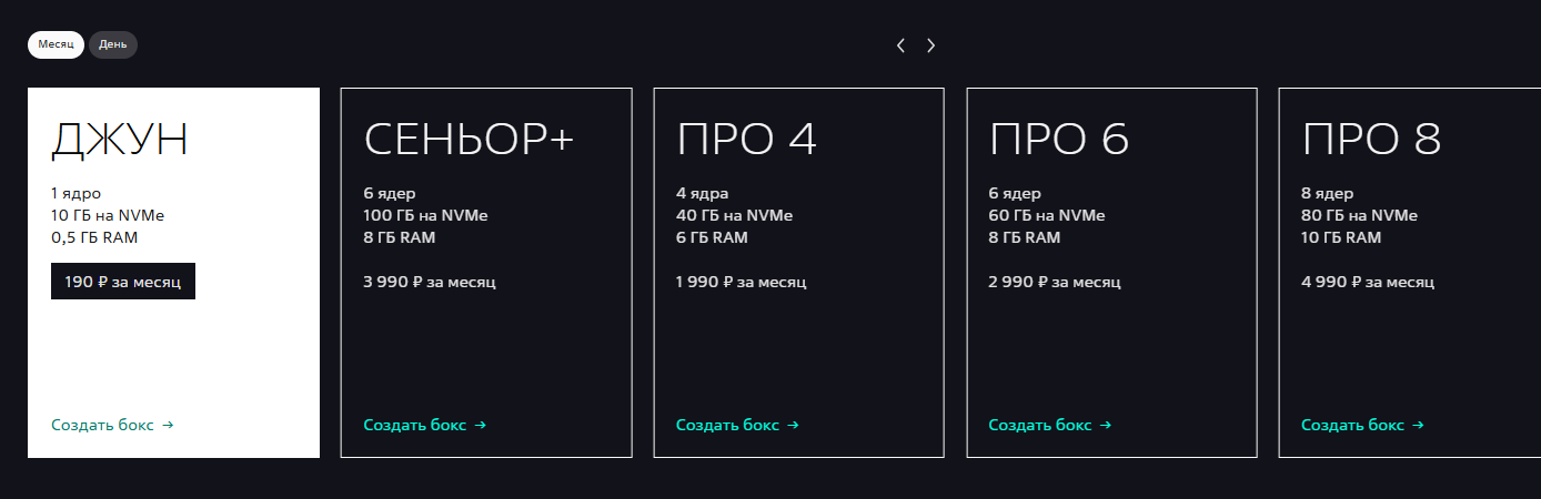 У Sprintbox есть 10 тарифов, которые называются, где предоставляются разное количество ядер и объем памяти. Причем платить можно как за день, так и сразу за месяц.