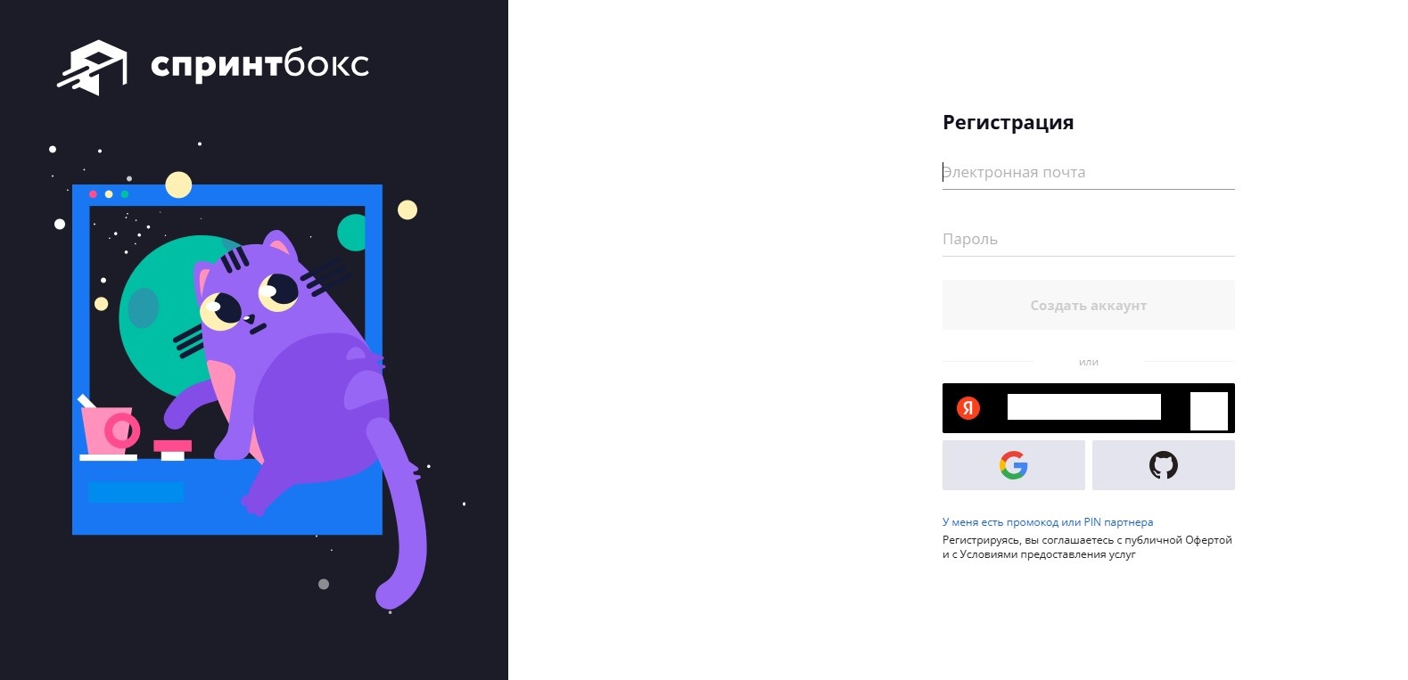 Чтобы начать пользоваться услугами сервиса Sprintbox, нужно зарегистрироваться на официальном сайте. Вам понадобится указать e-mail и придумать пароль. Также вам предложат зарегистрироваться автоматически через аккаунт на Яндексе, Google или GitHub.