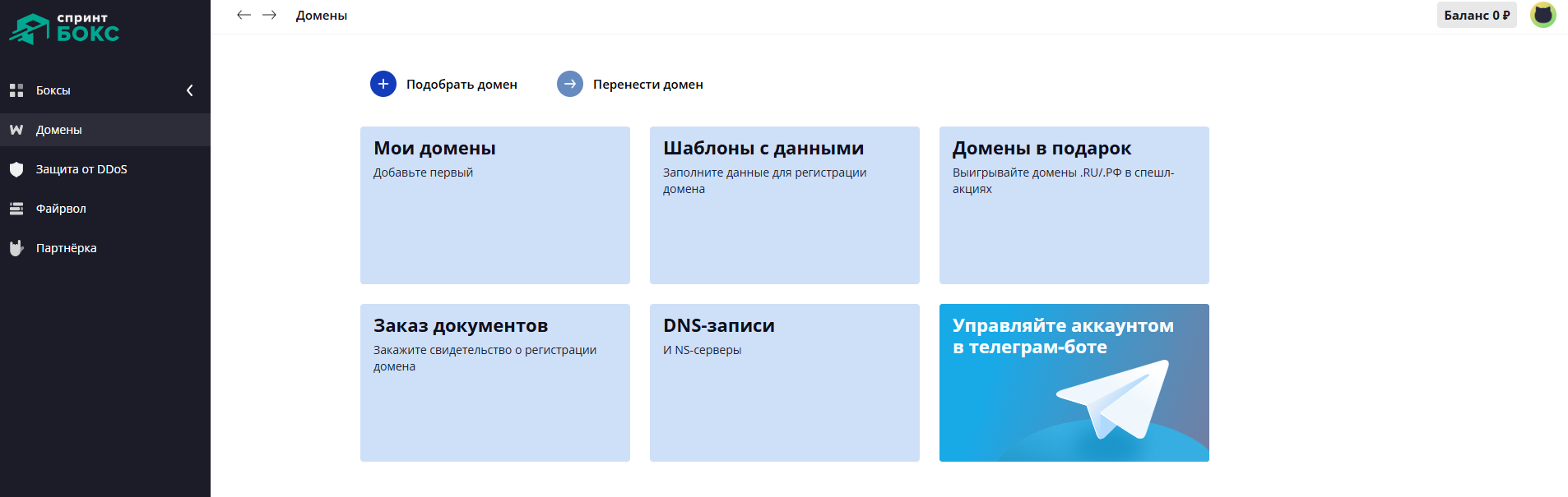 В этой вкладке размещается информация о ваших доменах. Здесь можно посмотреть шаблоны с данными, DNS-записи и запросить документ о регистрации домена. Также есть кнопка по подборку и переносу домена.