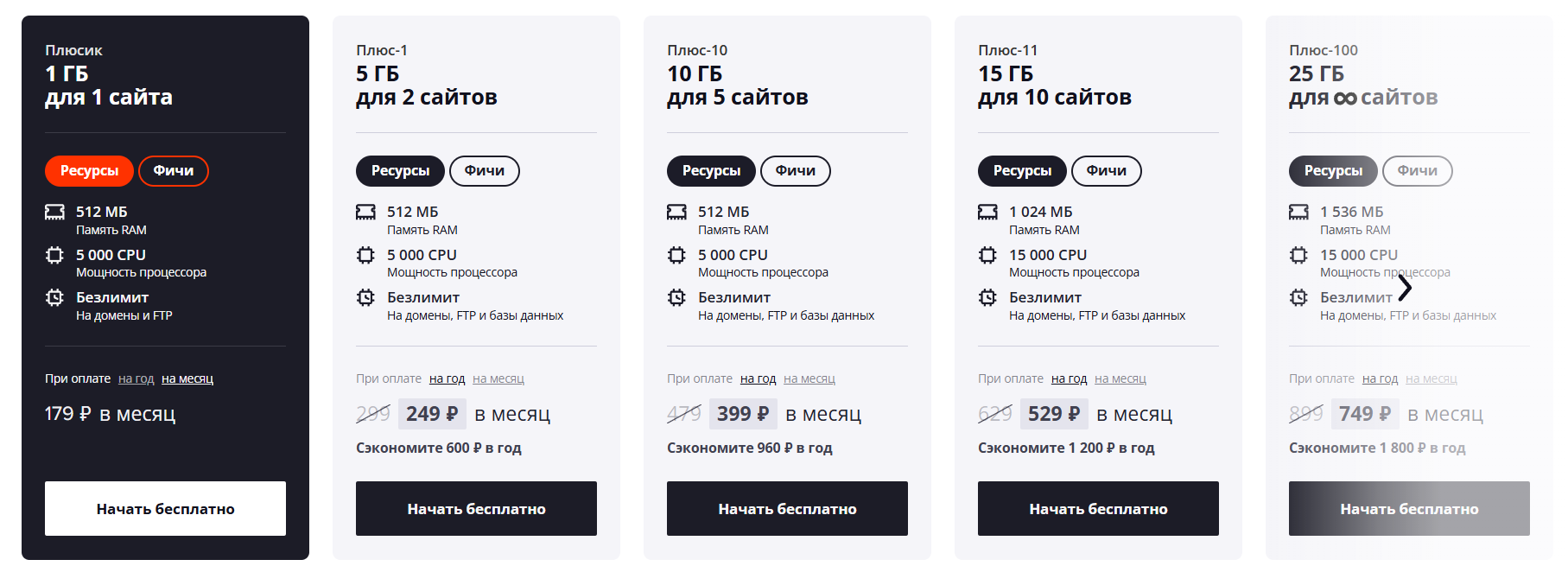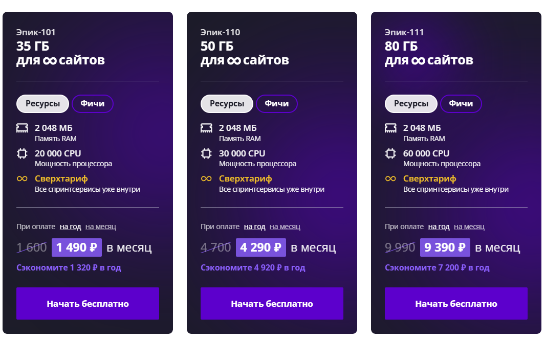 Продвинутые тарифы, под более ресурсоемкие сайты начинаются от 1490 руб. Конфигурации здесь заметно мощнее, плюс дополнительные фичи в виде безлимитных почтовых ящиков, защиты от DDoS и прочего.