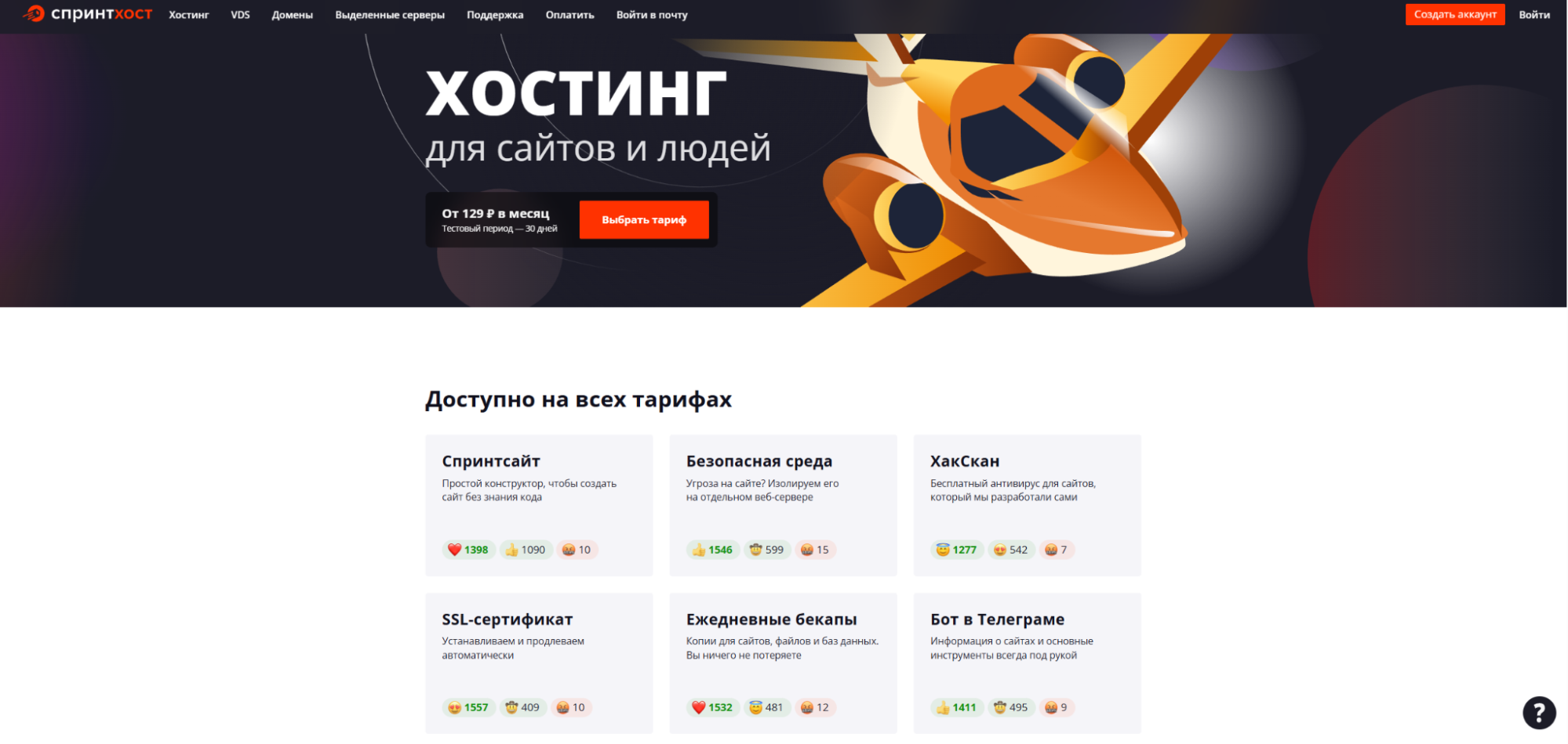 Спринтхост — популярный и надежный хостинг-провайдер, работающий на серверах в РФ с аптаймом в 99,9%. Подойдет как для обычных сайтов, так и для масштабных проектов. Предлагает все стандартные для ниши виды услуг по приятным ценам, качественную и компетентную поддержку пользователей, а также возможность бесплатного тестирования. На рынке с 2005 года, по информации самого провайдера количество размещенных у него сайтов превышает 500 тысяч.
