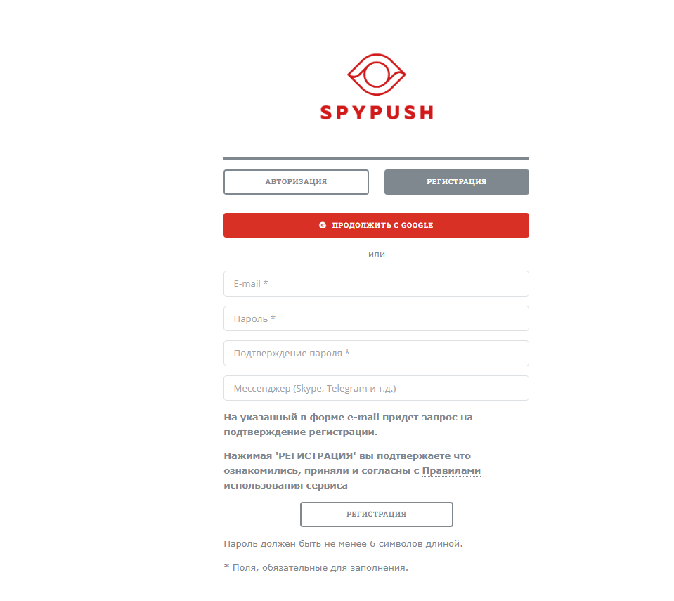 Чтобы начать работать со спай-сервисом SpyPush, нужно пройти только довольно простую регистрацию на официальном сайте, который доступен на русском и английском языках. Вам необходимо указать e-mail и придумать пароль. По желанию можно указать свой ник в Telegram. Затем вам на почту придет письмо для подтверждения регистрации.