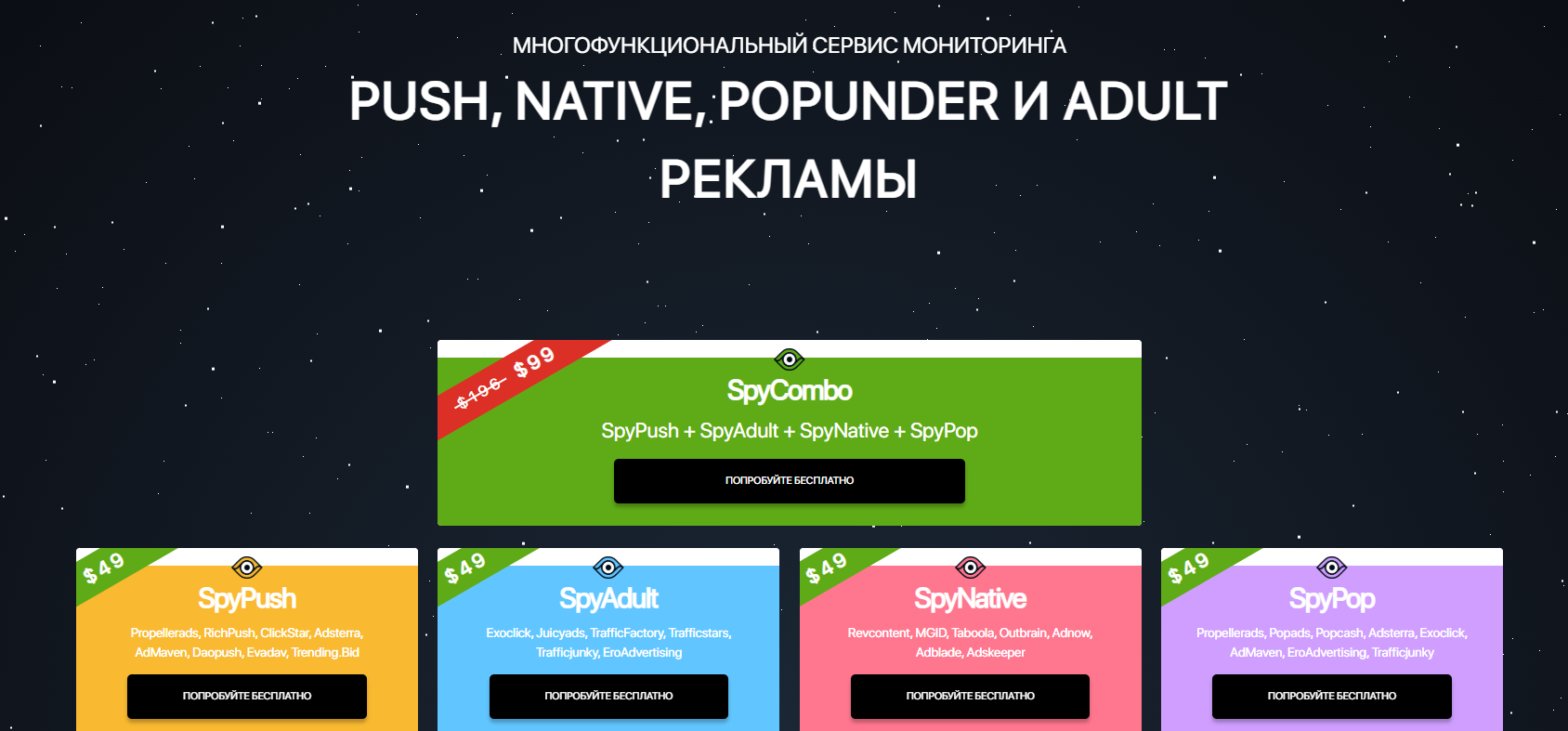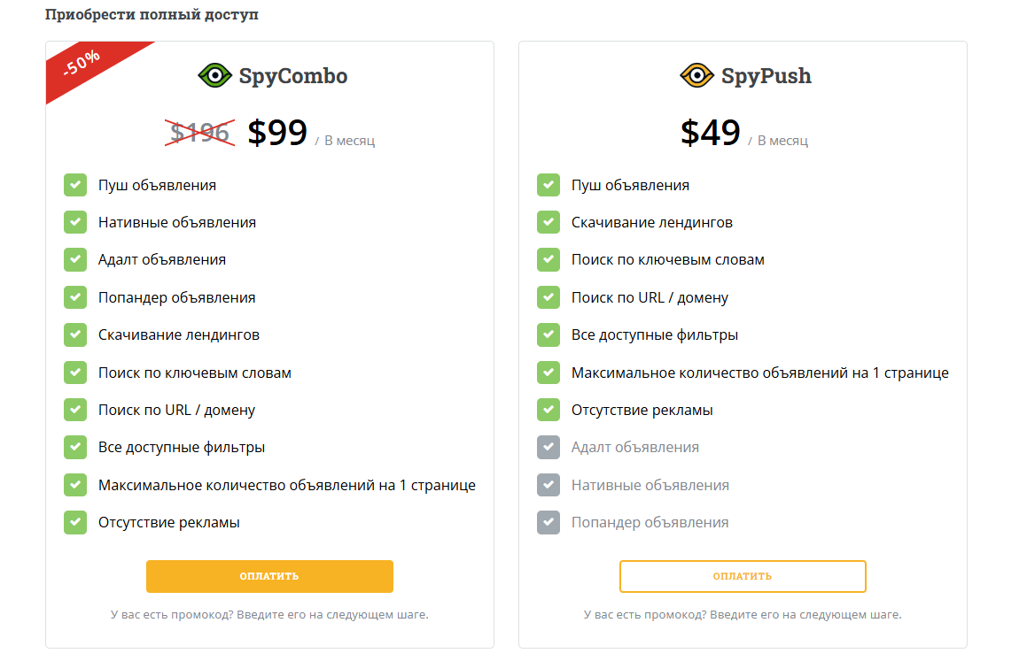 SpyPush предлагает бесплатный доступ к сервису на первые 24 часа после регистрации. Также у сервиса 5 платных тарифов, каждый из которых отличается форматом рекламы и подборкой рекламных сетей для мониторинга. Специализированные подписки — SpyPush, SpyAdult, SpyNative и SpyPop. Все они имеют одинаковый ценник — $49 в месяц.