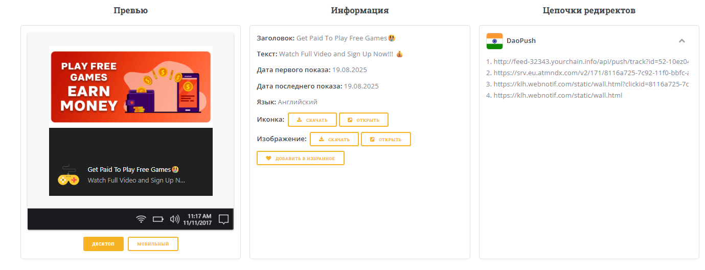 В зависимости от формата нужной вам рекламы, вы можете открыть SpyPush, SpyAdult, SpyNative и SpyPop. Интерфейс везде будет одинаковый, меняться будут только результаты выдачи. Слева также есть раздел «Избранное», где находятся сохраненные креативы, которые вы выделили среди остальных.