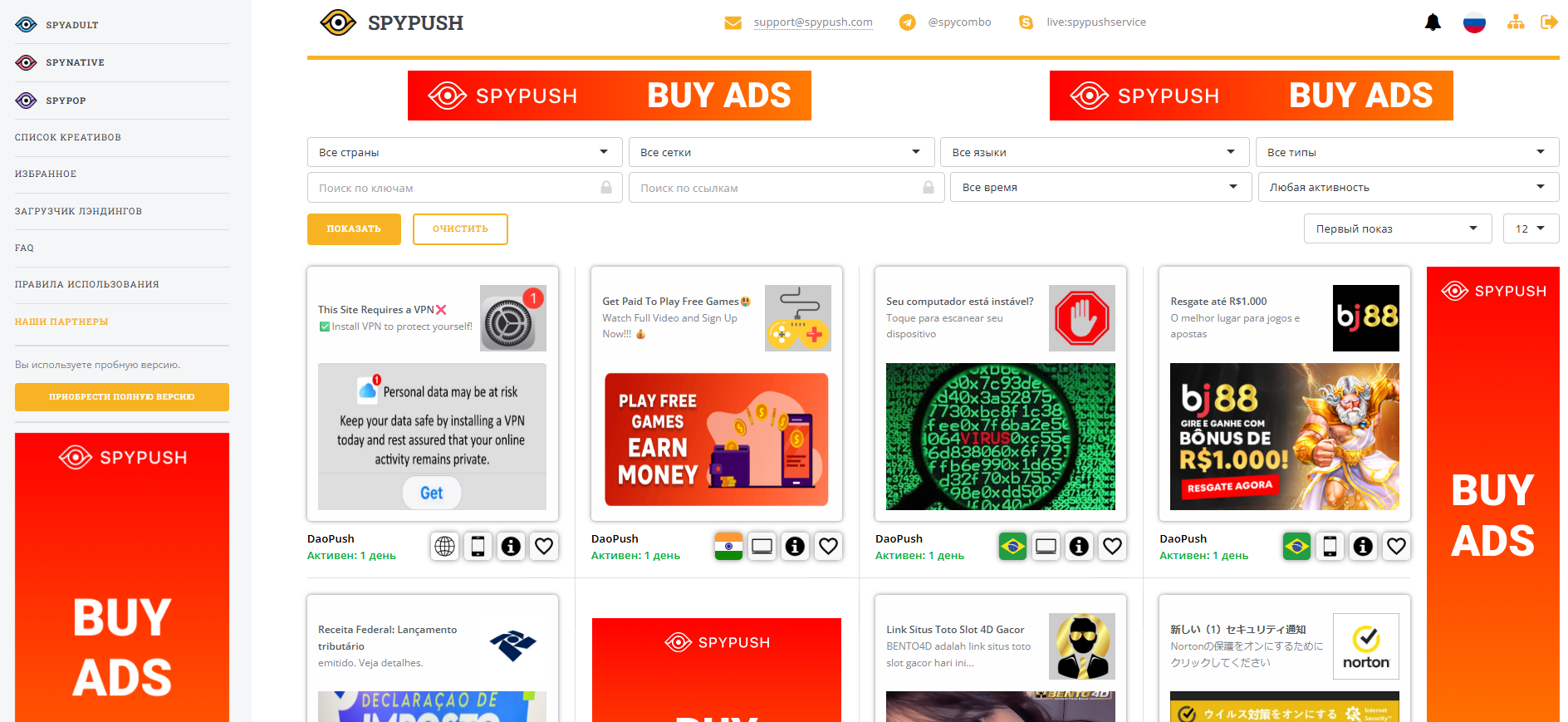 Также пользователи SpyPush получают бонусы и скидки на услуги сервисов-партнеров, например, в RichAds, ClickAdilla.