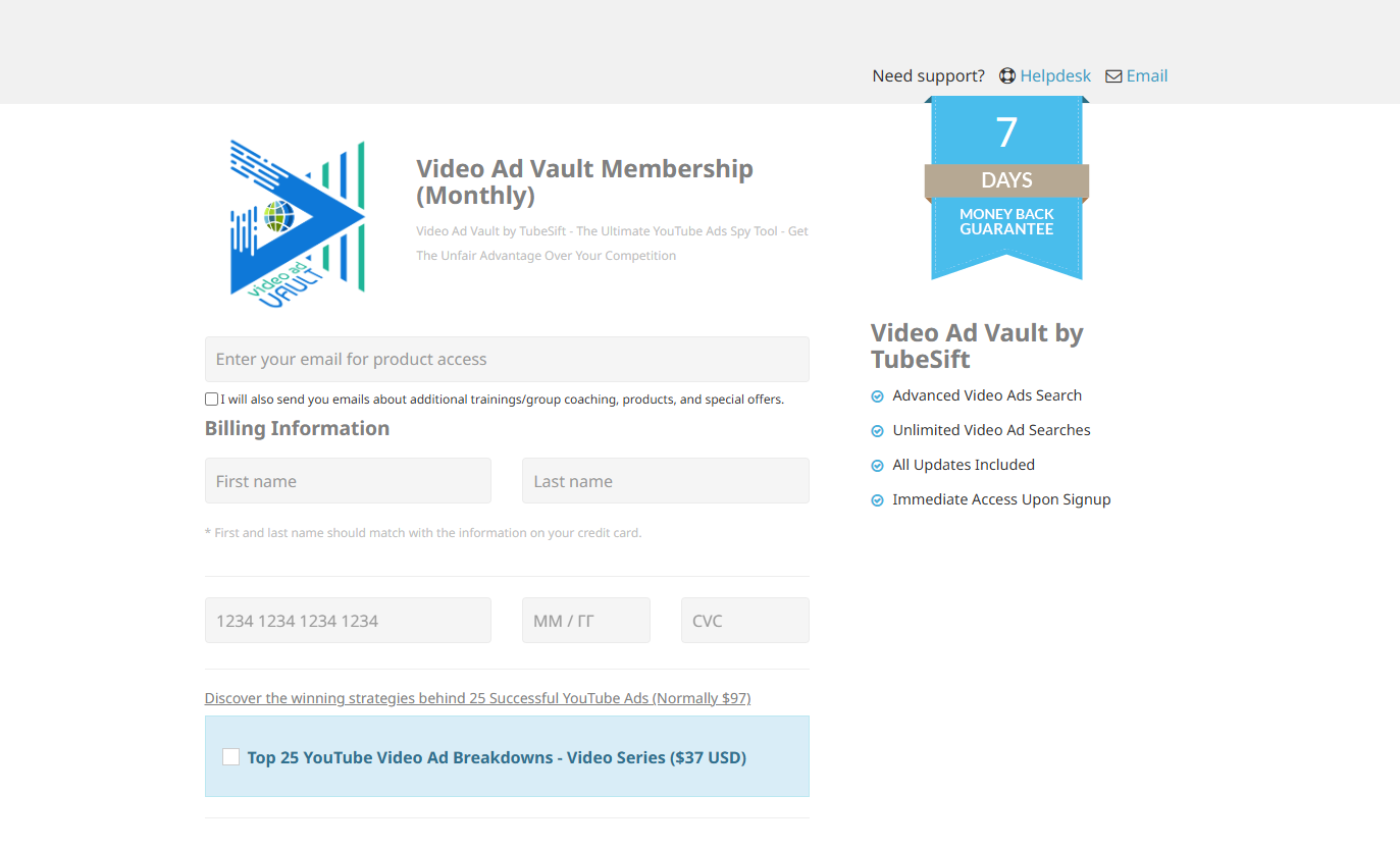 Video Ad Vault не имеет бесплатного триала. Чтобы получить доступ к сервису, нужно сразу оплатить один из двух тарифов — Essential или PRO.