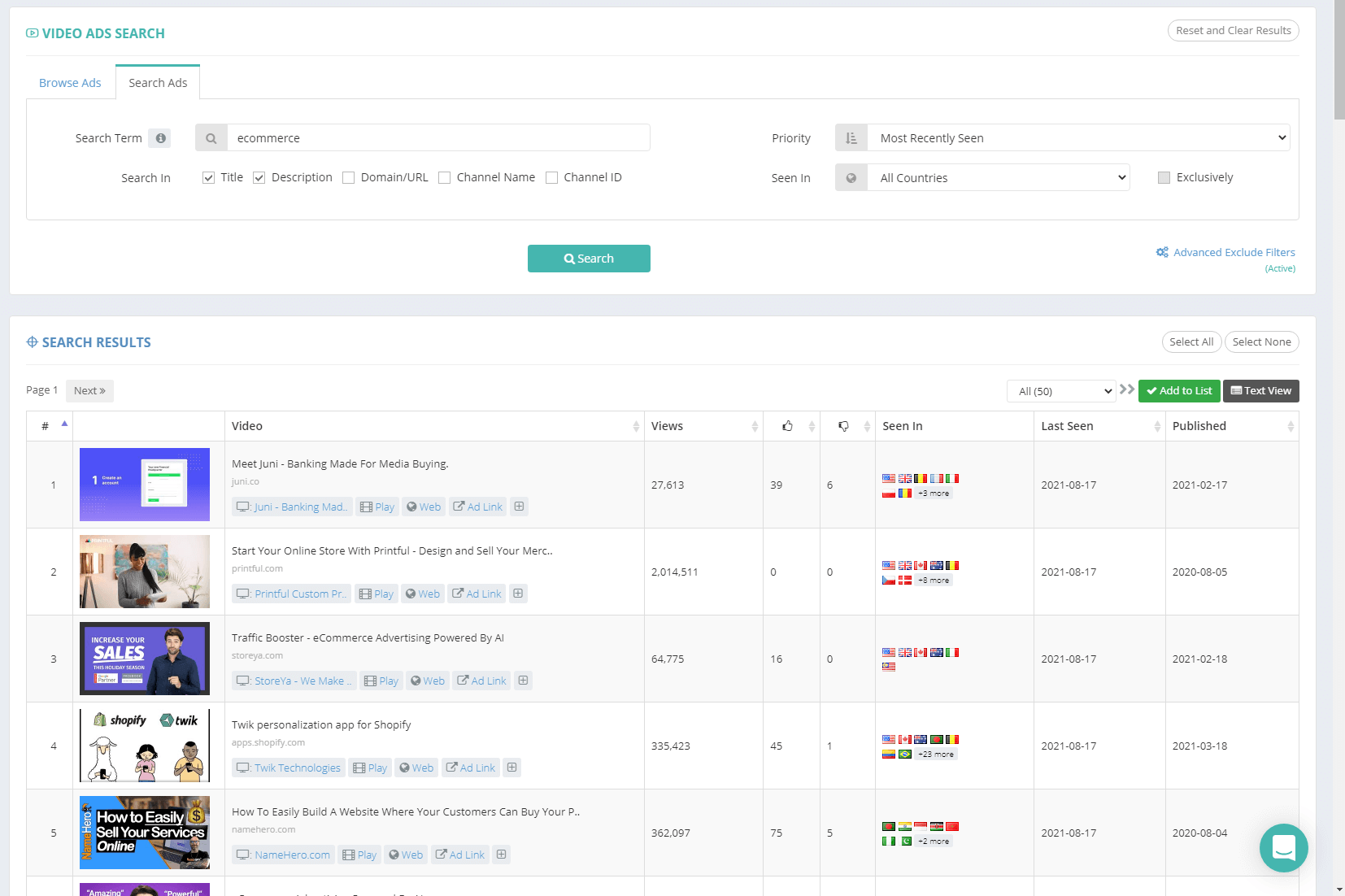 В разделе Video Ads Search есть два раздела. В Browse Ads можно просматривать рекламу на YouTube: данные можно фильтровать для удобства, например, по времени публикации, ГЕО, активности рекламы.