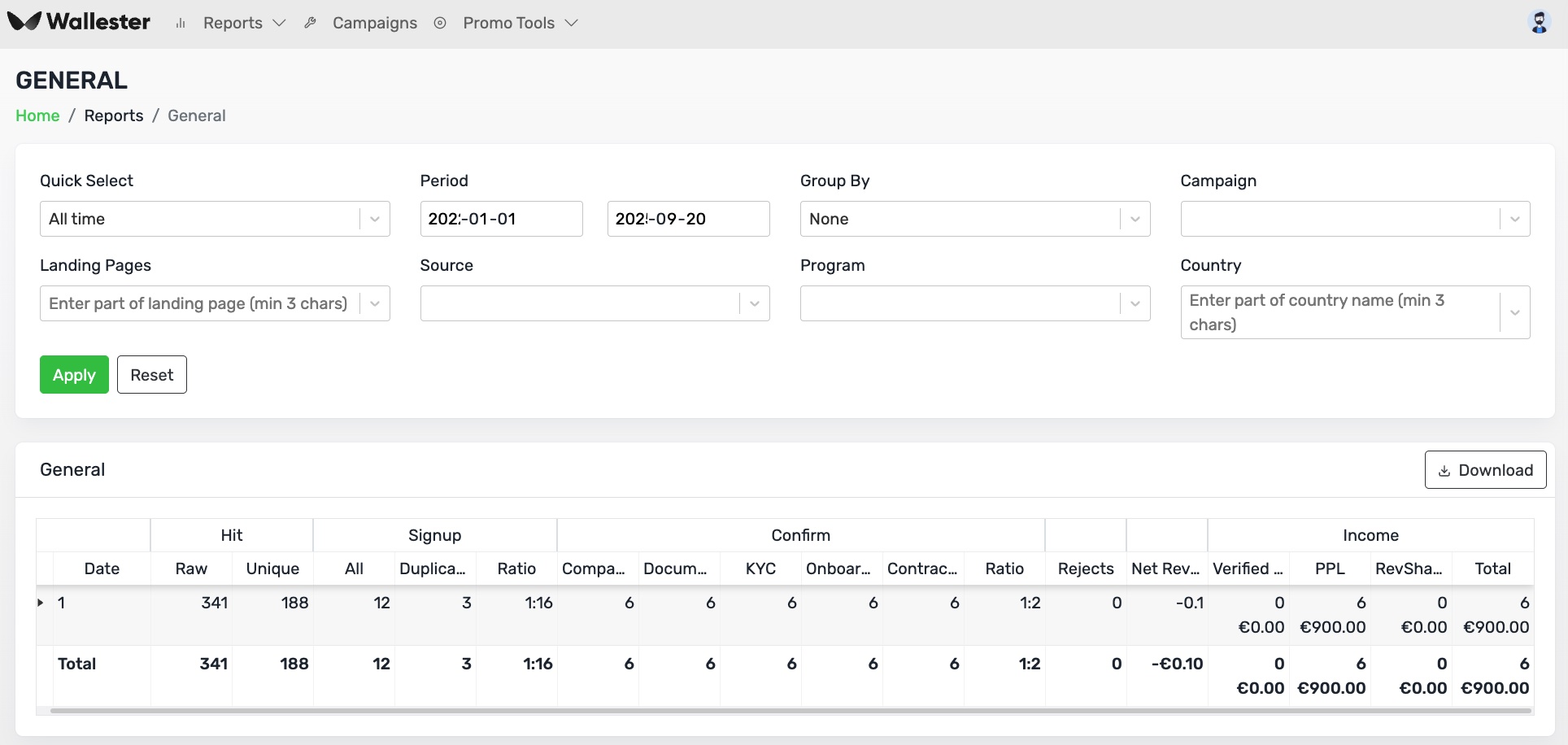 1. Reports - раздел для отслеживания ключевой статистики по аккаунту в реальном времени. Там 4 типа отчетов - Общий, по Кампаниям, по Странам и по Клиентам. Пример общего отчета я уже показал выше в нашем кейсе.